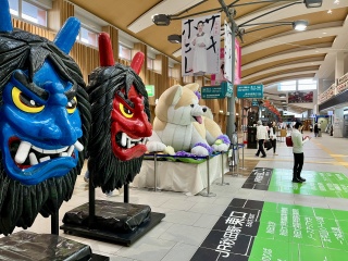 なまはげとあきたワンコがお出迎えしています。が、やっとの思いで地面に降り立った皆さまにとってはそれどころじゃないですよね。